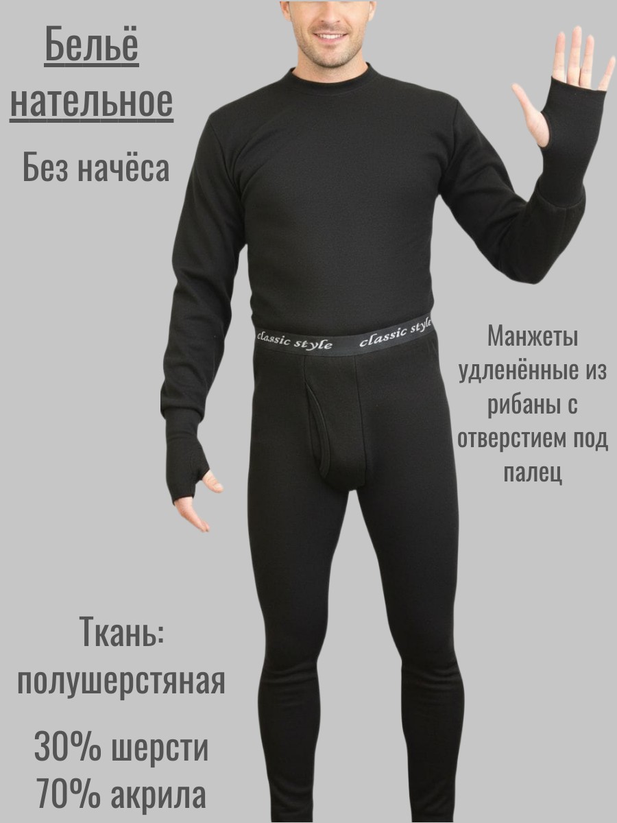 Комплект термобелья мужской (состоит из лонгслива с удлененной манжетой под палец и кальсон) произведен из высоко качественного, полушерстяного полотна . Универсальное решение для всех любителей активного отдыха, благодаря удлененной манжела Ваши руки всегда будут в тепле. Двухслойное мягкое и плотное термобелье отлично сочетается с любой верхней одеждой.Подходит для холодной погоды. Комфортный режим использования 0 / -25 градусов. Очень хорошо отводит влагу и аккумулирует тепло тела. Комфортные удлененные манжеты, мягкая резинка, анатомический крой способствует плотной посадке по фигуре, что способствует комфортному активному отдыху. Белье нашего производства не стесняют движений и обеспечивают долгую носку. Удлиненный лонгслив закрывает поясницу. Подходит для любого вида туризма и отдыха, рыбалки, охоты, сноубординга, горнолыжного спорта, хоккея, любых зимних видов спорта, а так же повседневного использования. В нем будет тепло и комфортно. Размерный ряд термобелья представлен от 44 до 64 размера. Рекомендуем машинную стирку наизнанку при 30 градусах. Термобелье или как его еще называют термокомплект будет радовать Вас своим теплом в самые лютые морозы. Комплект Термобелья для мужчин будет прекрасным подарком мужу или другу, а большая размерная сетка, поможет подобрать вам Термобелье, на самый оптимальный для вас размер.