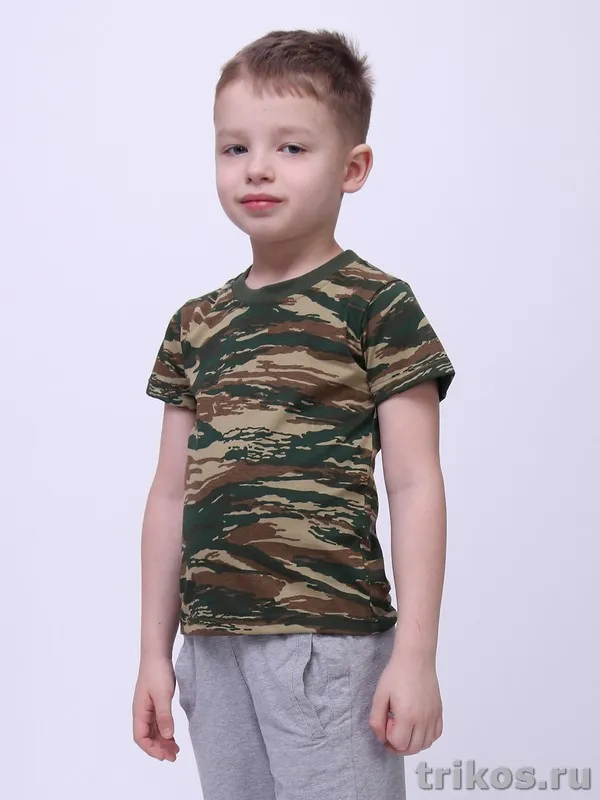 Предлагаем частным и корпоративным клиентам сертифицированные детские футболки популярной камуфляжной расцветки. Модель классического прямого покроя, с коротким рукавом и округлым вырезом горловины. Может служить дополнением комплекта кмф или использоваться как самостоятельный предмет в сочетании со спортивными брюками, джинсами, шортами. Удачное решение для активного ребенка. Подходит для посещения кадетских классов, специализированных кружков, туризма и рыбалки. А также для повседневной носки, летних прогулок, занятий спортом. Футболка изготовлена из 100% хлопкового полотна. Этот материал не вызывает аллергии, хорошо пропускает воздух и впитывает влагу при потоотделении.