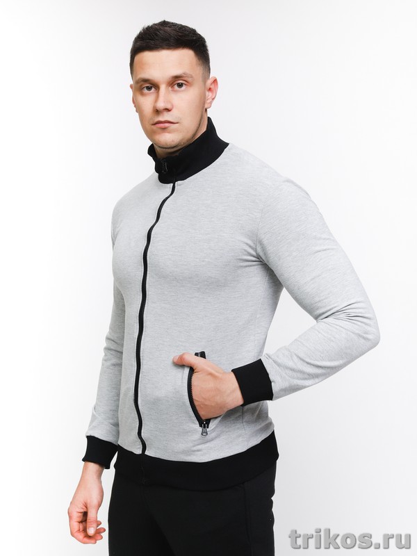 Трикотажная олимпийка – популярный предмет мужского гардероба. Она отлично подходит для стиля спортивного или кэжуал, особенно в молодежной среде, для ношения дома. Особенности фасона – воротник-стойка, широкие манжеты-резинки, короткая или длинная застежка на молнии. В межсезонье её можно использовать как верхнюю одежду, зимой – как второй слой на футболку, водолазку, тонкий джемпер. Удачно комплектуется с джинсами, спортивными брюками. Мы предлагаем модель с длинной молнией, которую можно расстегивать и носить как ветровку или летнюю куртку. Она изготовлена из футера 2-х нитки с петельчатой изнанкой с составом 80% хлопок,14% полиэстер, 6% эластан. Это достаточно плотный трикотаж, но при этом мягкий, с гладким ворсом на изнаночной стороне. Пропускает воздух и впитывает влагу, не вызывает раздражения и аллергии. Футер хорошо тянется, но не деформируется. Не образует катышков, не линяет, прочный износостойкий материал.