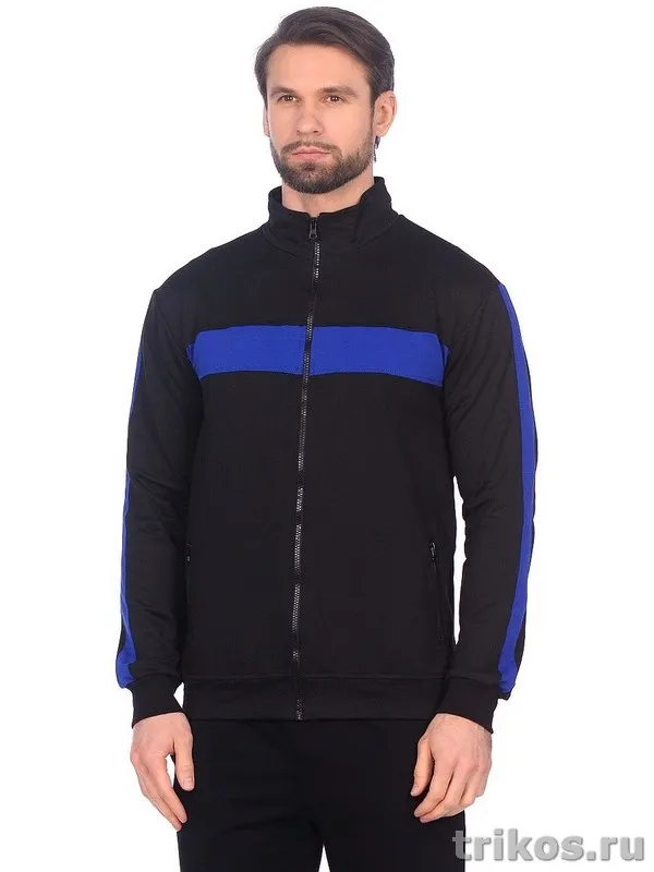Трикотажная олимпийка – популярный предмет мужского гардероба. Она отлично подходит для стиля спортивного или кэжуал, особенно в молодежной среде, для ношения дома. Особенности фасона – воротник-стойка, широкие манжеты-резинки, короткая или длинная застежка на молнии. В межсезонье её можно использовать как верхнюю одежду, зимой – как второй слой на футболку, водолазку, тонкий джемпер. Удачно комплектуется с джинсами, спортивными брюками. Мы предлагаем модель с длинной молнией, которую можно расстегивать и носить как ветровку или летнюю куртку. Она изготовлена из футера 2-х нитки с петельчатой изнанкой с составом 80% хлопок,14% полиэстер, 6% эластан. Это достаточно плотный трикотаж, но при этом мягкий, с гладким ворсом на изнаночной стороне. Пропускает воздух и впитывает влагу, не вызывает раздражения и аллергии. Футер хорошо тянется, но не деформируется. Не образует катышков, не линяет, прочный износостойкий материал.