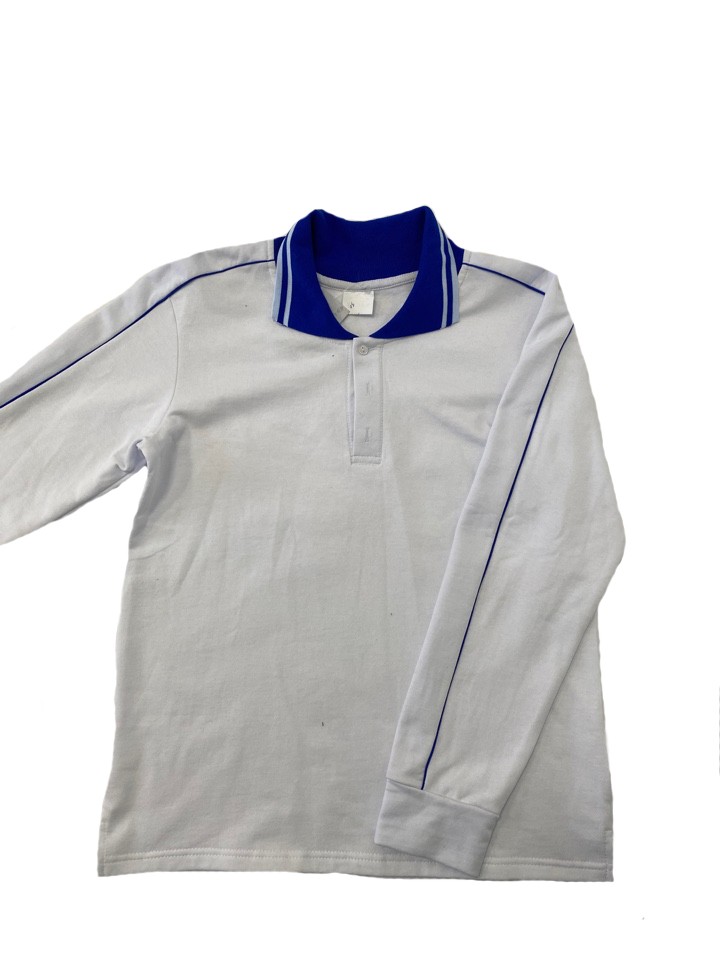 Рубашка поло с длинным рукавом – популярный выбор для повседневной носки. Подходит для прохладного летнего дня, а также в составе комплекта под пиджак, джинсовую куртку, пуловер и т. д. Мы предлагаем оптовым покупателям модель в спортивном стиле: отложной воротник, напоминающий олимпийку, кант на рукавах и плечах. Рукав втачной, с широкими манжетами. Цвет белый, воротник и окантовка синяя (оттенок василёк). Крой свободный. Материал – футер 2-нитка из 100% хлопка. Это дышащая ткань особого переплетения, гладкая снаружи и с мелким ворсом с изнанки. Очень приятная на теле, быстро поглощает влагу, практически не мнется. Изделия из футера прочные и долговечные, устойчивые к многократной стирке. В такой рубашке будет удобно на прогулке, в поездке, во время активного отдыха.