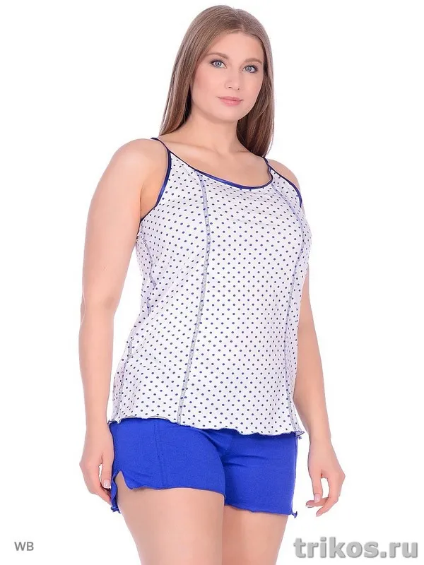 В шкафу многих девушек и молодых женщин место летних халатов и ночных сорочек заняли очаровательные пижамы с шортиками. Эти легкие симпатичные комплекты одинаково подходят и для домашнего отдыха, и для сна. Они позволяют и на кухне, и на диване перед телевизором выглядеть аккуратно и привлекательно. В жаркое время года в них удобно спать, не накрываясь простыней. В нашем каталоге модель с топом на тонких бретелях и короткими шортами, такие комплекты часто дополняют пеньюаром или изящным халатиком. Топик с принтом в горошек, шорты однотонные. Пижама из 100% хлопка – идеальный выбор для сна. Она приятна к коже, не раздражает и не натирает, впитывает пот и пропускает воздух. Размерный ряд – от 44 до 50. Рекомендуем покупать на размер больше, потому что после стирки натуральная ткань может сесть.