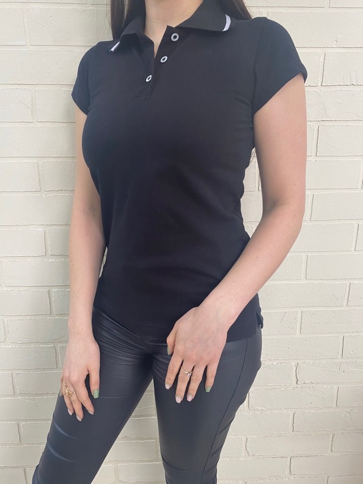 Рубашка поло – мастхэв гардероба современной женщины. Это одежда на все случаи жизни: на учебу, в офис, на мероприятия разного формата, на прогулку и т. д. Подходит для активного отдыха, фитнеса, игры в теннис, бадминтон и некоторых других видов спорта. Нередко используется в качестве униформы, в этом случае на ней наносится логотип фирмы или акции. Предлагаем классический вариант рубашки поло – приталенный силуэт, короткие рукава, отложной воротник, застежка на три пуговицы, лаконичный дизайн. В нашей модели декор – окантовка воротника в тон пуговицам. Рубашка хорошо садится практически на любой тип фигуры, не стесняет движений. Цвет тенниски – черный, особенно эффектно будет сочетаться с белым низом. Изделие пошито из трикотажа на основе 100% хлопка. Натуральная ткань прекрасно вентилирует тело, отводит влагу от кожи. Приятная на ощупь, не раздражает кожу, гипоаллергенная.