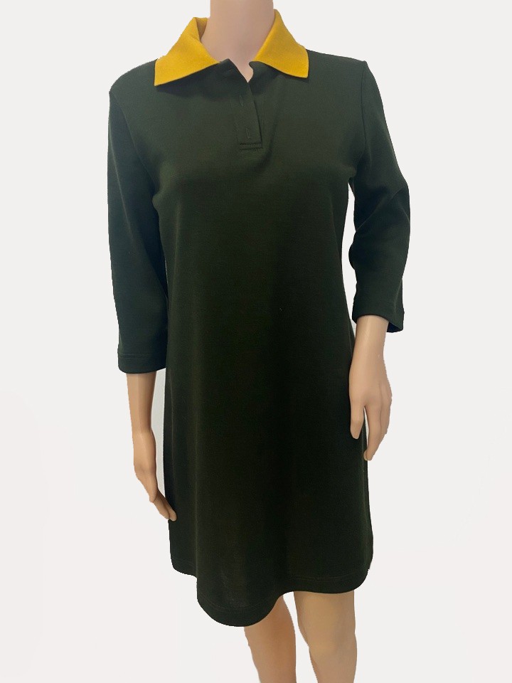 Трикотажное платье поло – культовая модель, не выходящая из моды на протяжении не просто лет, а поколений. Благодаря удачному крою и разнообразному дизайну подходит для женщин разного возраста и телосложения. Платья-тенниски пользуются особой популярностью у сторонниц активного образа жизни. В нашем каталоге – классическая модель с отложным воротником и короткой застежкой на полочке. Слегка приталенный силуэт зрительно уравновешивает линию бедер. Рукав 3/4, втачной, на манжете. Цвет олива, акцентированный ярко-желтым воротником. Универсальная одежда для повседневного ношения. Смесовый трикотаж 30% шерсть 70% акрил – мягкий на ощупь, легкий и теплый материал, хорошо сохраняющий форму изделия.